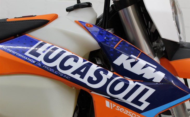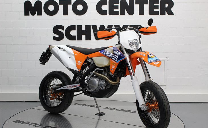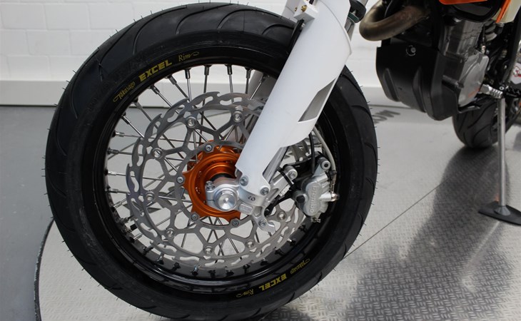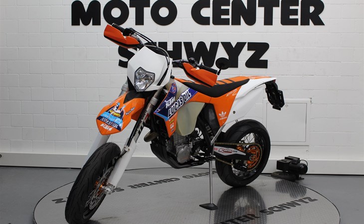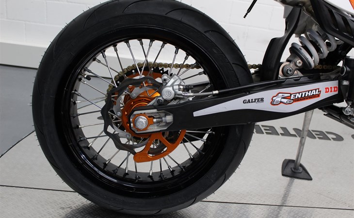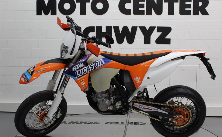 KTM 500er EXC mit Supermoto Rädern und grosse oversize Bremsscheibe vorne.